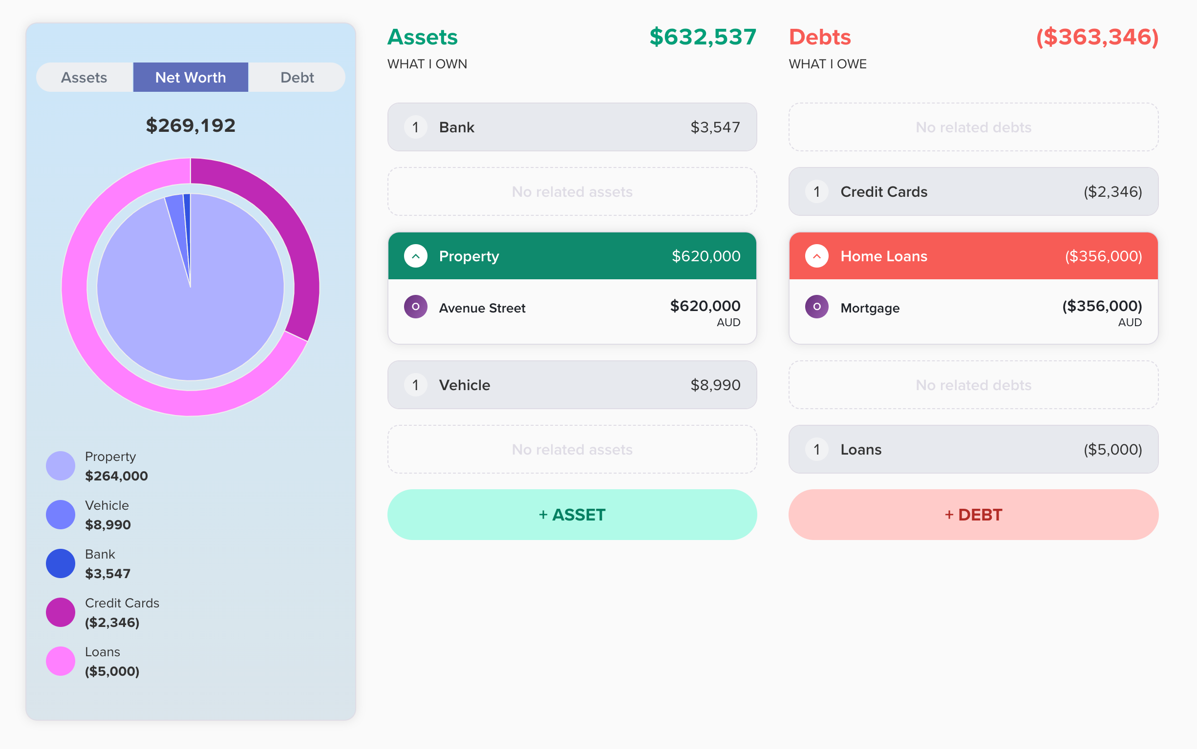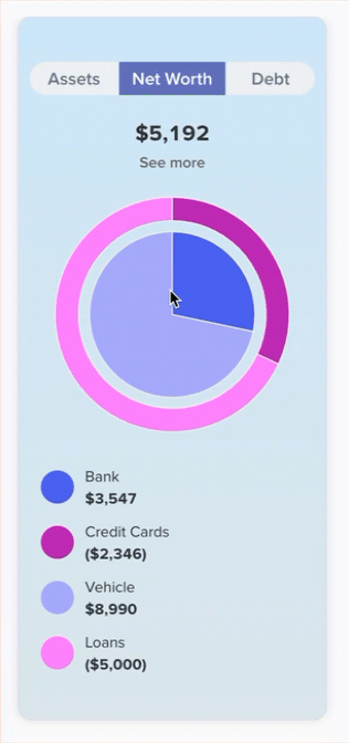 Track your net worth with the new dashboard widget, as well as the breakdown of your assets and debt into their different account types.