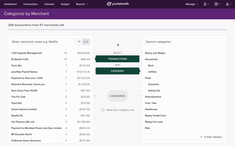 All beta users now have access to a new page which allows you to categorize transactions by their merchant name. Working from left to right or right to left, you’re able to select one or more transactions grouped by their merchant and a category, then click categorize. Drag and drop is also available, for one or groups of transactions too!