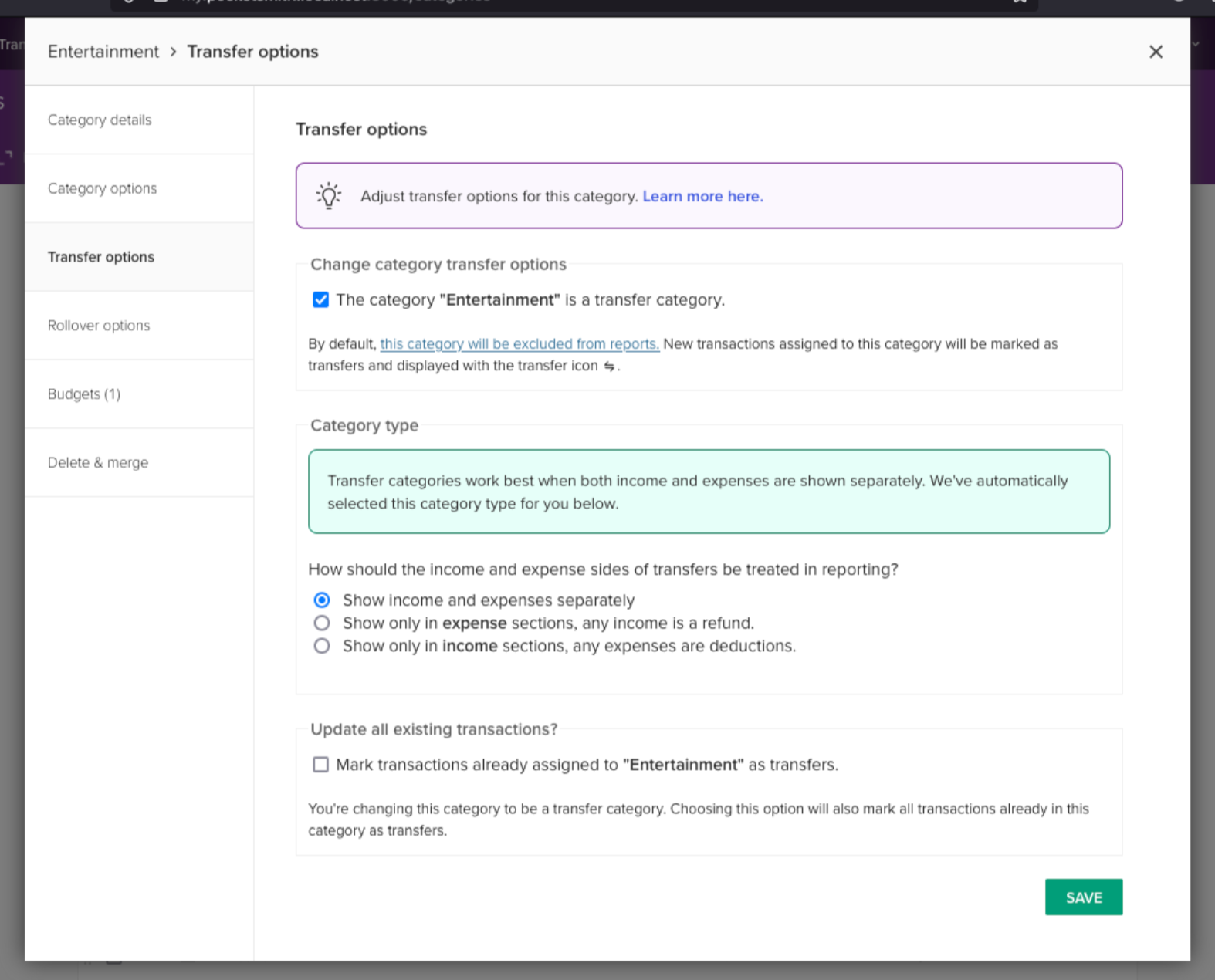 We have added a ‘Transfer options’ section when editing a category. This is now where you select to make a transfer category and manage the transfer options for the category.
