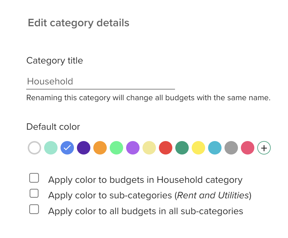 Relevant checkboxes are now shown within the category edit form to apply the colour you’ve selected for the category to a) all budgets in the category, b) all sub-categories and c) all budgets in those subcategories.
