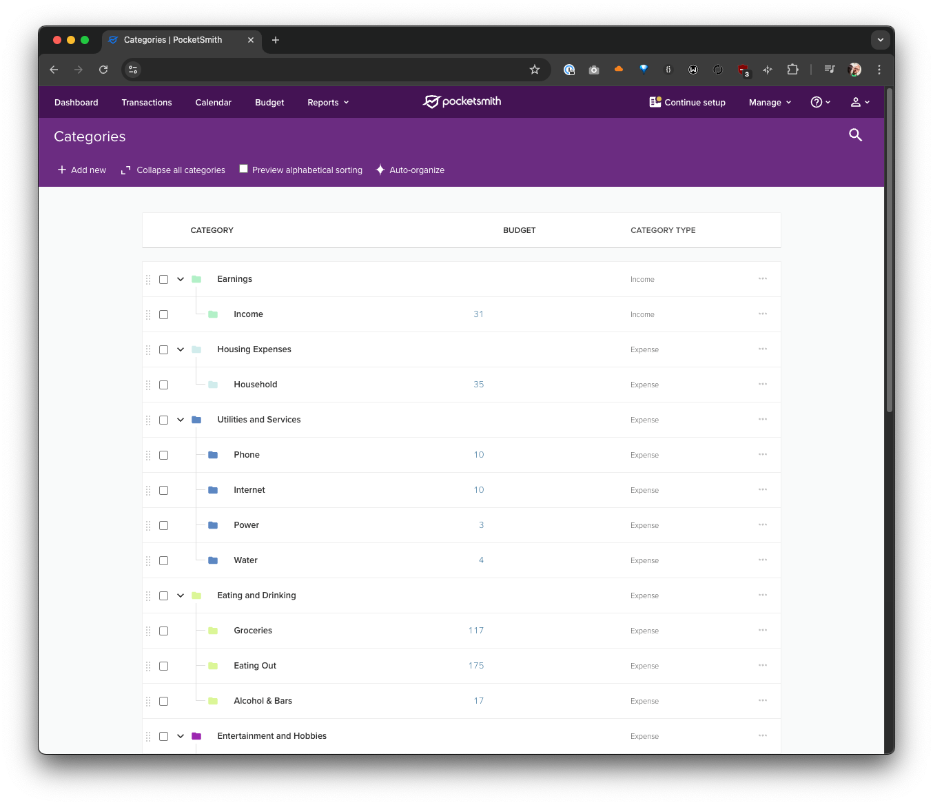 While this primarily affects people getting set up with PocketSmith for the first time, you’re also able to apply this category structure to your existing categories in PocketSmith by clicking the “Auto-organise” button in the Categories page toolbar.