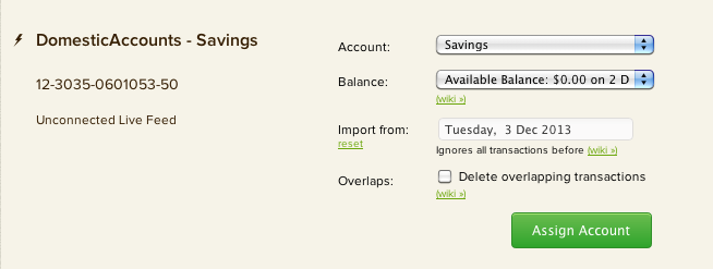 Select the ‘Delete overlapping transactions’ option to ensure that any existing transactions beyond the “import from” date are overwritten, removing duplicates. You can use this to make sure that no transactions are missed (the existing import may not have contained all the transactions on its last day) by changing the ‘Import from:’ date to a day or two earlier, and checking this option before clicking ‘Assign account’.