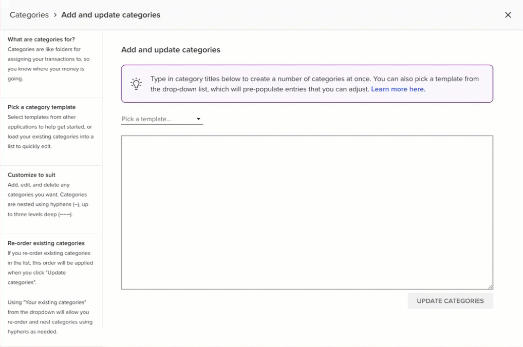 This will only add new categories, change the category order, and adjust sub-category levels — it isn’t possible to delete categories with this interface.