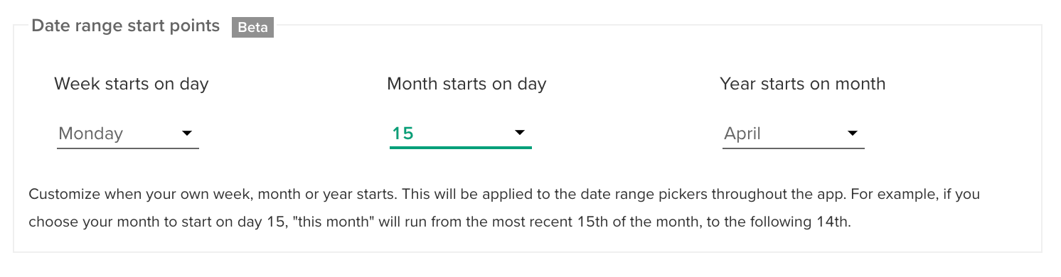 For example: You might want to start the month of the 15th, as this is when you get paid. Or, start the year in April to match the financial year in a different country.
