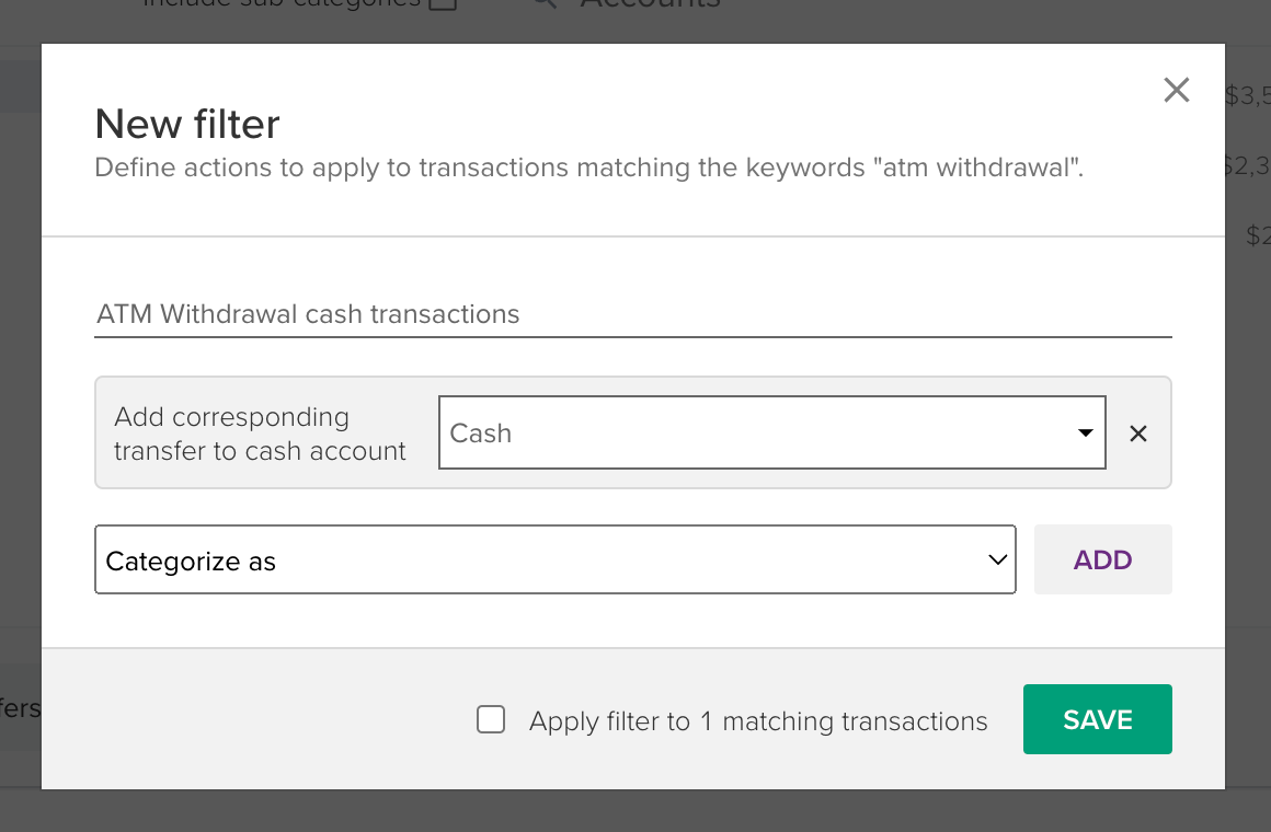 An example of how this can be used is with an ATM cash withdrawal as a transfer from your bank account to your cash account. You can use a filter to match the merchant name of the cash withdrawal from the ATM in your bank account that then creates a new transfer transaction in your cash account with the matching amount.