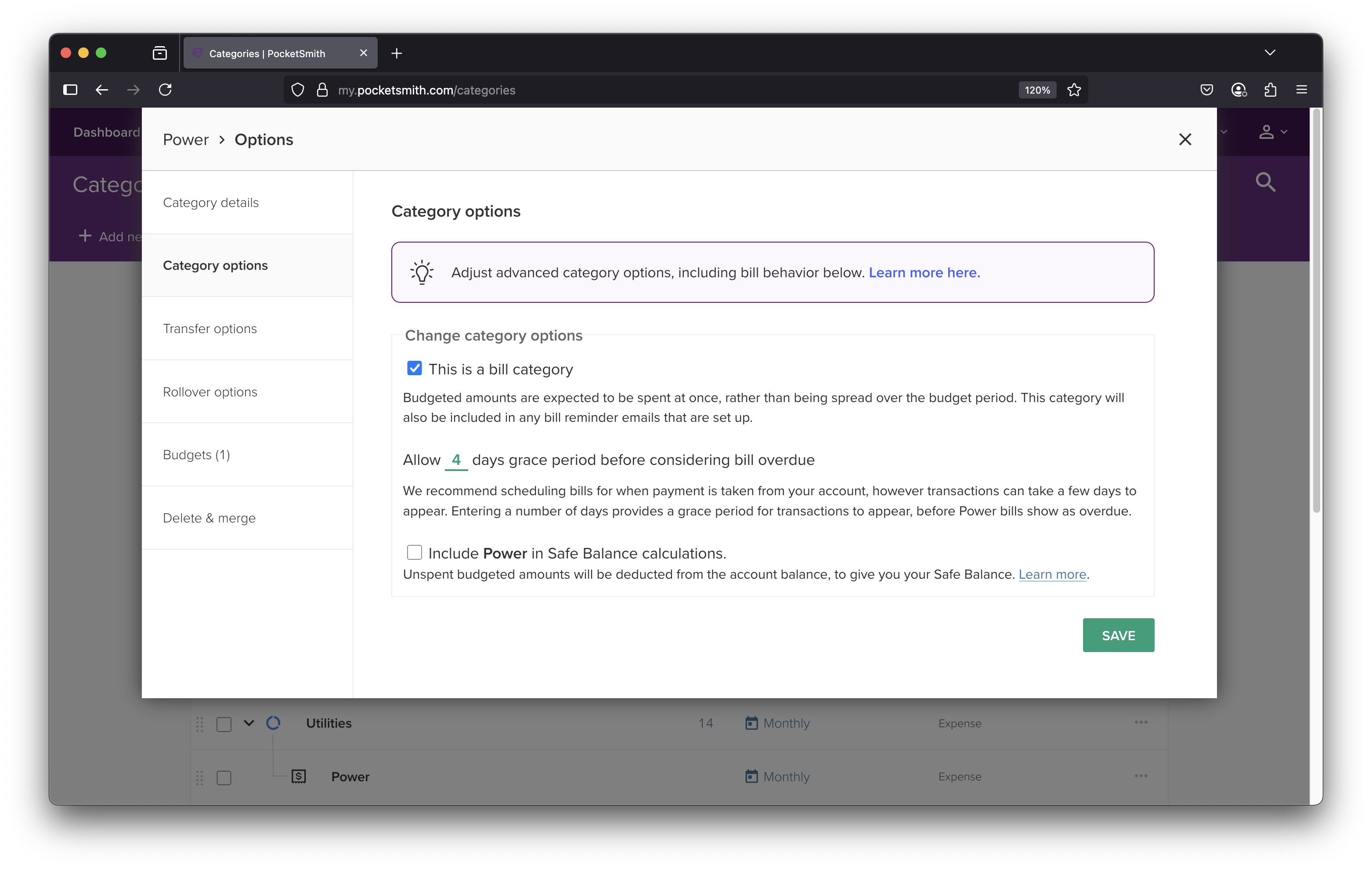 This is useful if you experience any delay in bill transactions appearing in PocketSmith, despite the payment having left your account. Previously the bill would show as “overdue” during this delay – now if you enter a grace period in days, it’ll show as an “upcoming” bill instead during the delay. Also helpful if you like to live life on the edge and delay paying your bills, but still stay on track with Safe Balance!