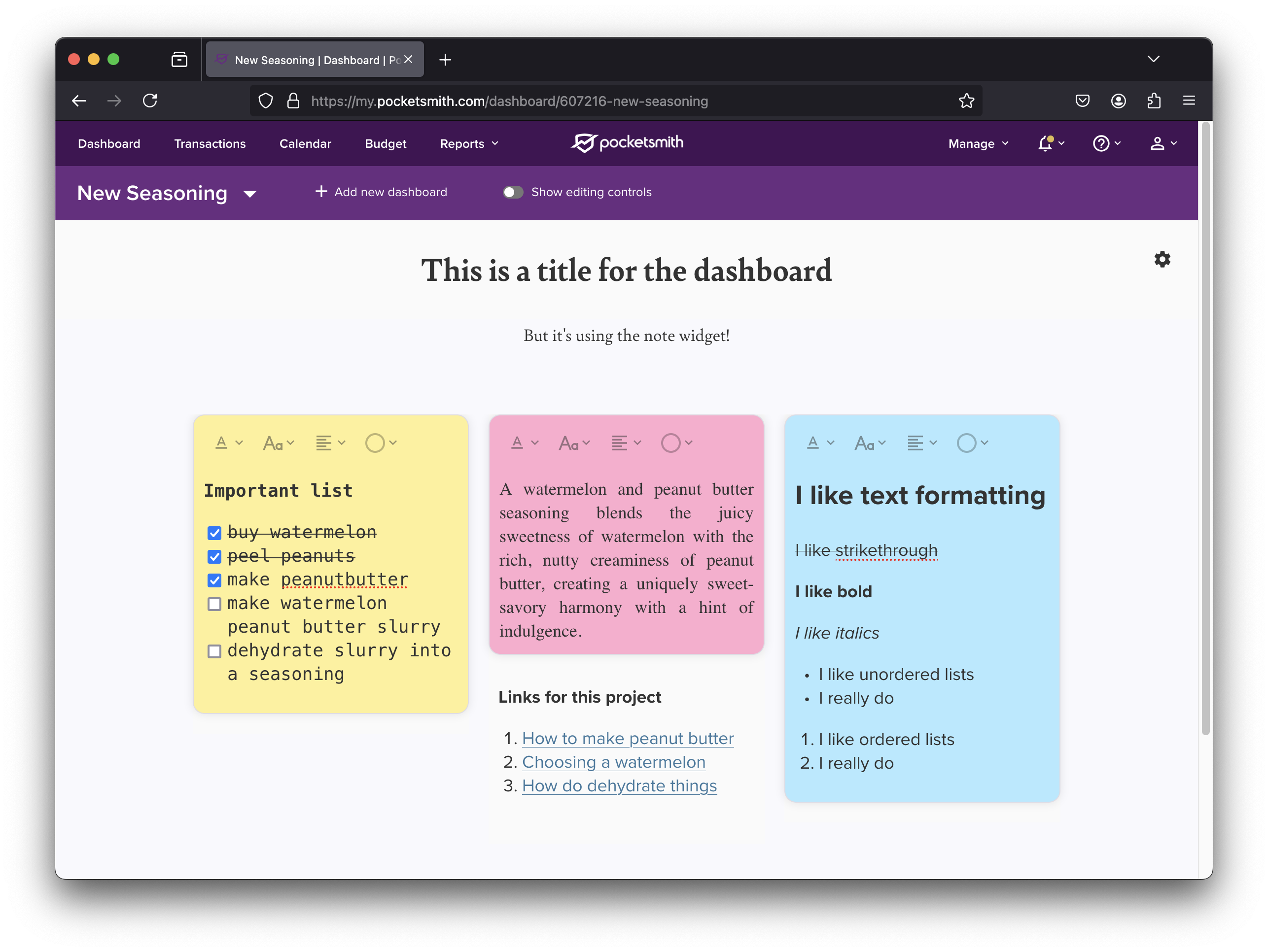 A note widget has been released for the Dashboard! A long-requested addition, this allows you to jot things down as you’re working in PocketSmith.