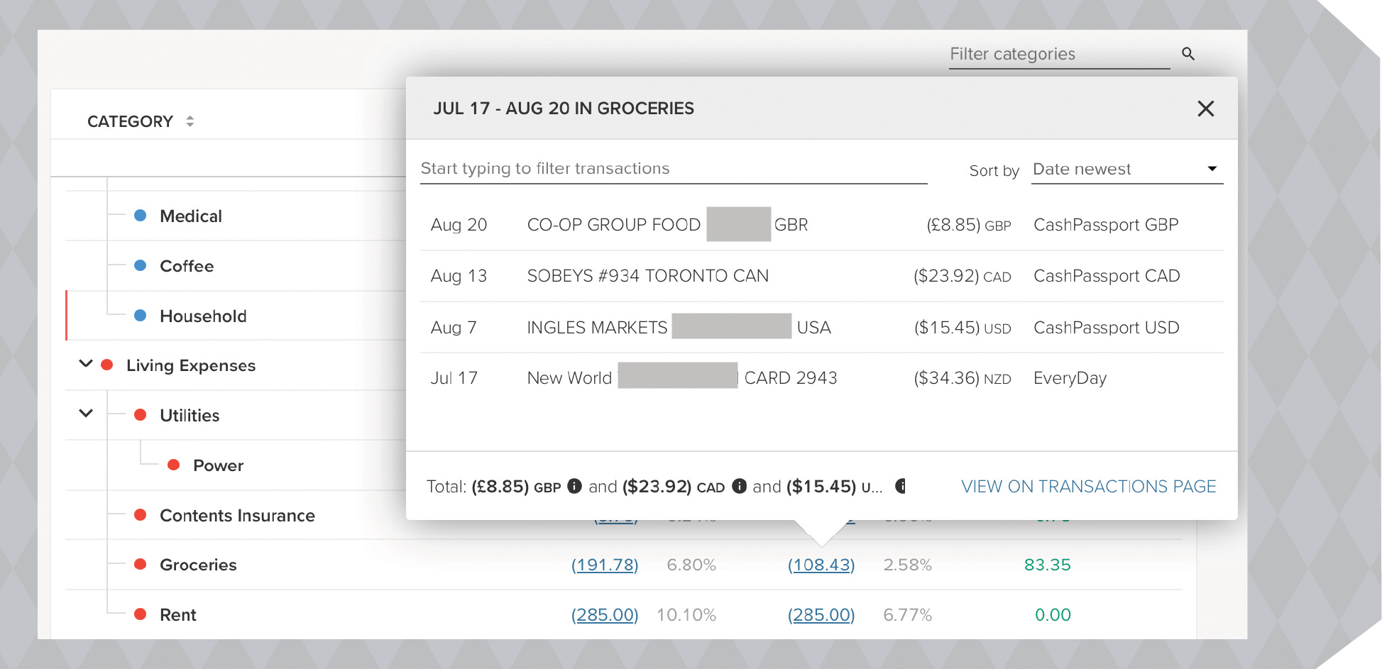 So, aye, the currency conversion carries through to the Transactions page. But it doesn’t stop at glancing over the Transactions page and seeing four different currency codes. On the Calendar, you’ll see individual transactions in their own currency and an overall total converted to your native currency. On the Income & Expense report, a category will roll up to show an overall total; but click into it, and you get the breakdown of transactions in each individual currency.