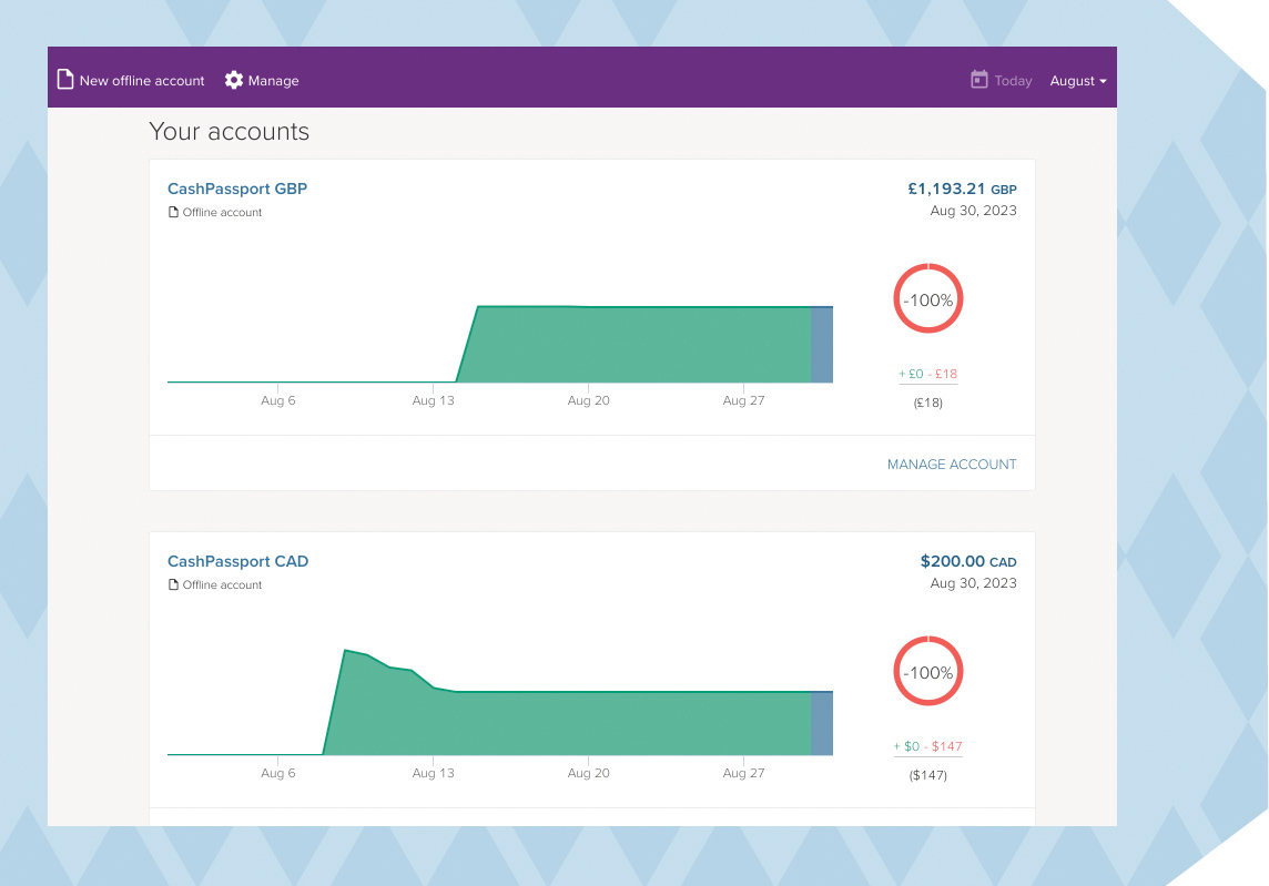 Offline accounts work just as well to track cash in multiple currencies! A lot of places simply don’t have card facilities and only accept local cash. Besides, I’m not the first person to find a spare NZD$20 note in my wallet as I step off the plane in Aberdeen… right?