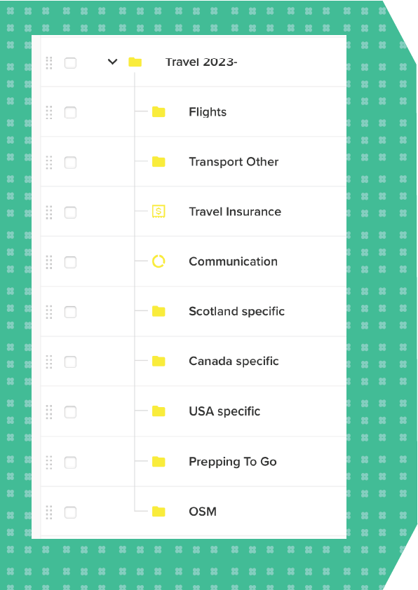 They were specific to the country, so why not file them as that? One category for “USA specific”, one for “Canada specific”, and one for “Scotland specific”. Done. That gave me seven sub-categories nested under a parent category in bright sunshine yellow.