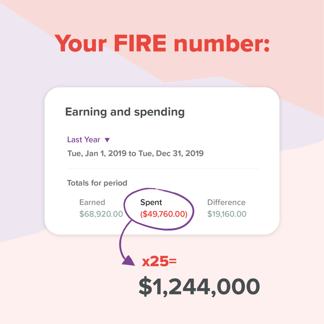 Say your annual expenses are $50,000, then your FIRE number is 25 times that, or $1,250,000.