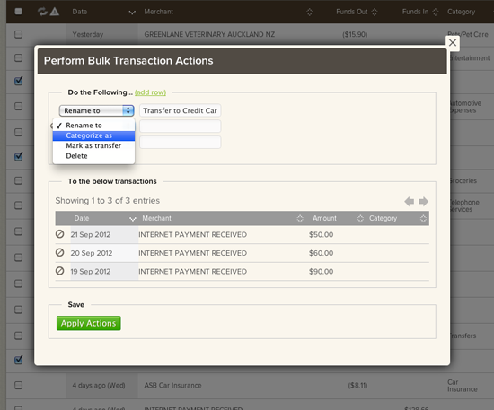 Related to the Filters, you’re now also able to perform similar actions en-masse in the Merchants and Bank Statements pages. Just select the individual transactions or merchants you’d like to edit (rename, categorize, mark as transfer or delete) and click the “Bulk Actions” button available.