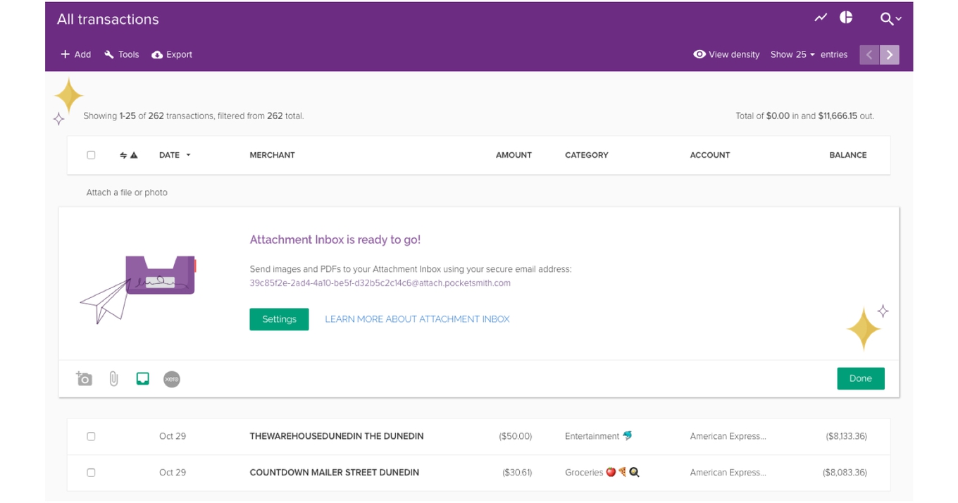 Through the magic of email, you can now store attachments in PocketSmith, by sending images and PDF documents to a specially generated email address. The stored attachments can then be assigned to transactions, just as you would manually add attachments to your transactions currently.
