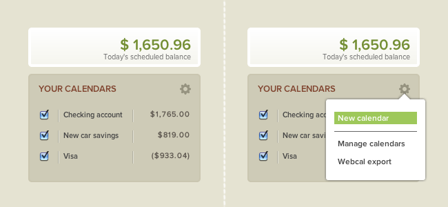 Notice the new ‘Scheduled balance’ indicator. This helps you quickly see how much you’re scheduled to have today. You may click this to edit today’s balance across all your calendars - which is similar to clicking on the balance at the bottom of a calendar day. This indicator displays your actual balances when viewing the calendar in Transactions mode, or when you are on the Bank Statements page.